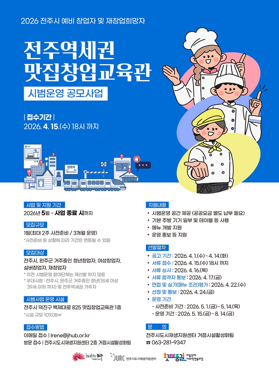 ![]() 2026년 전주역세권 맛집창업교육관 시범운영 공모사업의 참여 단체(자)를 모집합니다. 사업 및 지원 기간 : 2026년 5월 ~ 사업 종료 시까지 모집 규모 : 총 1팀(최대 2주 사전준비 / 3개월 운영) * 사전준비 등 상황에 따라 기간은 변동 될 수 있음 모집대상 : 전주시, 완주군 거주중인 청년창업자/여성창업자/실버창업자/재창업자 * 이전 시범운영 참여단체는 재선발 하지 않음 * 우대사항 : 전주시, 완주군 거주 중인 청년(18세 이상 39세 이하) 및 전주역세권 도시재생사업지 거주자 시범운영 시설 : 전주시 덕진구 백제대로 825 맛집창업교육관 1층 * 시설규모 : 109.08㎡ 지원내용 - 시범운영 공간 제공(공공요금 별도 납부 필요) - 기본 주방기기 일부 및 테이블 등 사용 - 메뉴 개발 지원 - 운영 홍보 등 지원 선발 절차 - 공고 기간 : 2026년 4월 1일(수) ~ 4월 14일(화) - 서류 접수 : 2026년 4월 15일(수) 18시 까지 - 서류 합격 단체 통보 : 2026년 4월 17일(금) - 면접 및 메뉴평가(실기) : 2026년 4월 22일(수) - 최종 합격 단체 통보 : 2026년 4월 24일(금) 접수 방법 - 이메일 접수 : lrene@jhub.or.kr - 방문접수 : 전주시도시재생지원센터 2층 거점시설활성화팀 문의 : 전주시도시재생지원센터 거점시설활성화팀 T. 063-281-9347 전주역세권 맛집창업교육관 시범운영 공모사업에 많은 관심과 참여 부탁드립니다. |